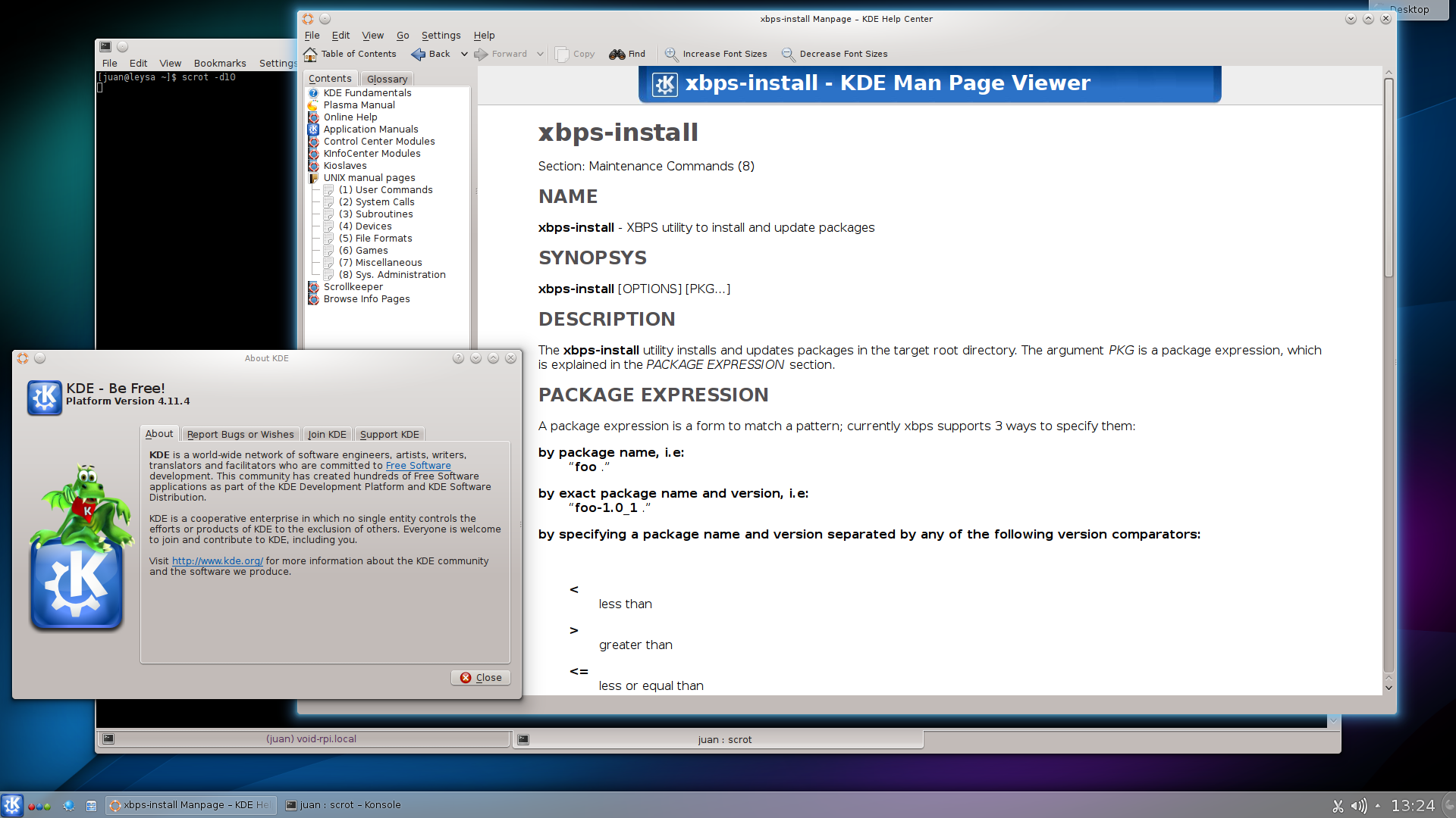 I’ve updated KDE to the latest stable version available: 4.11.4. The base packages for a minimal KDE are now available, but please note that many applications are not still packaged. Please join irc to help in providing more KDE applications.